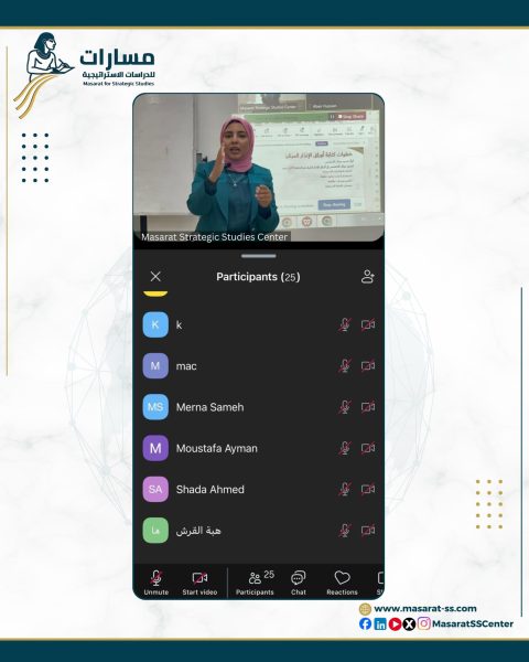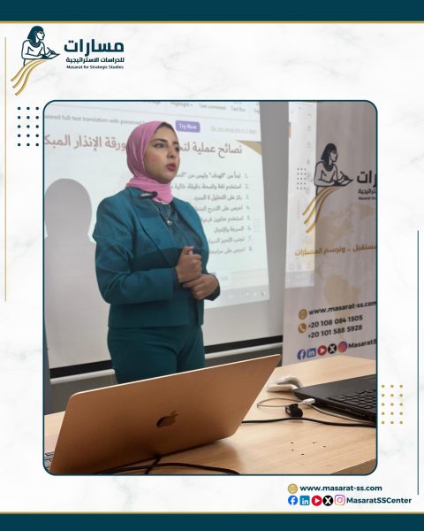 بمشاركة فاعلة من عدد من المتدربين (اوفلاين واونلاين) انطلقت فعاليات المحاضرة الأولى ضمن دورة “إعداد أوراق الإنذار المبكر”، التي نظمها مركز مسارات للدراسات الاستراتيجية، حيث قدمت د. إيمان الشعراوي محاضرة بعنوان “المدخل النظري للإنذار المبكر”، تناولت خلالها المفاهيم الأساسية لهذا المجال الحيوي، وأبرزت أهمية ورقة الإنذار المبكر كأداة داعمة لصناعة القرار، وارتباطها الوثيق بقضايا الأمن القومي.