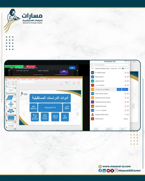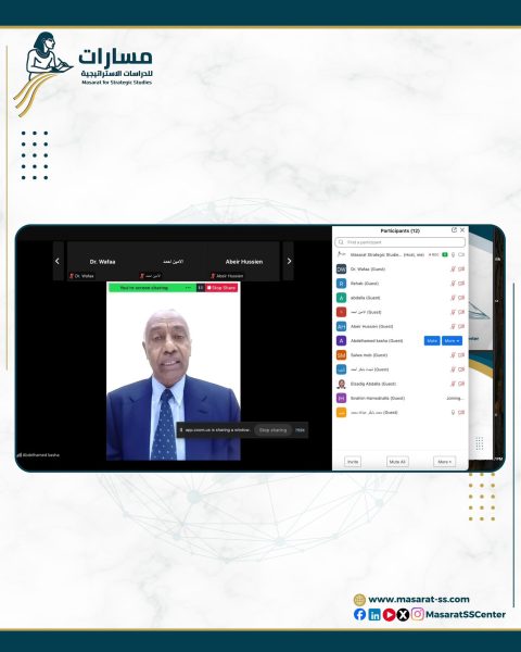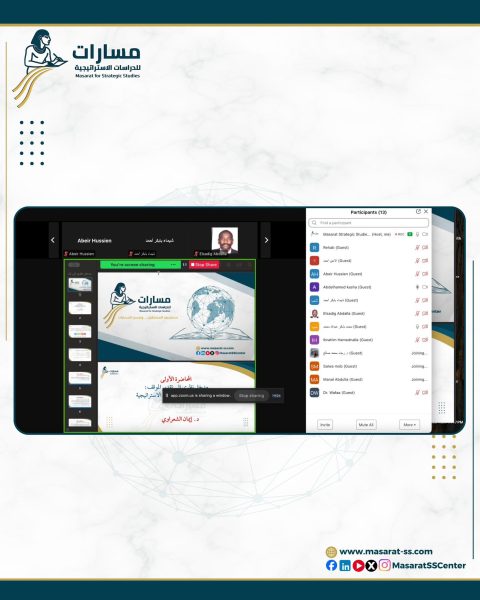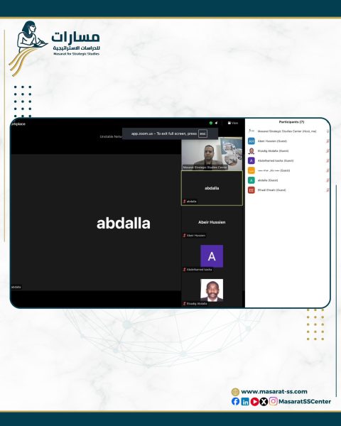 نظم مركز مسارات للدراسات الاستراتيجية أول دورة تدريبية للباحثين السودانيين المتواجدين داخل السودان عبر تطبيق «زووم»، وذلك بالتعاون مع منظمة كاشا السودانية، بهدف إعداد أوراق تقدير الموقف، في إطار مبادرة المركز لدعم الكوادر البحثية السودانية.